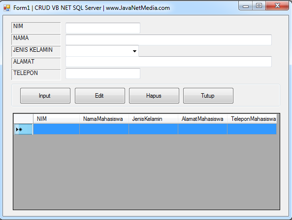 Membuat Aplikasi CRUD ( Create, Read, Update, Delete ) Visual Basic .Net Database SQL Server. Pada tutorial VB .NET kali ini saya akan melanjutkan Tutorial CRUD menggunakan VB .NET. Pada Tutorial sebelumnya saya sudah memberikan pembelajaran CRUD VB .Net database Access dan MySQL. Bagi anda yang sedang membuat Aplikasi VB .NET dan Database SQL Server maka tutorial kali ini adalah dasar dalam membuat sebuah Aplikasi. Fungsi ini sangat penting karena nantinya anda bisa Input, Edit dan Delete di dalam Form VB .NET yang datanya tersimpan di database SQL Server.